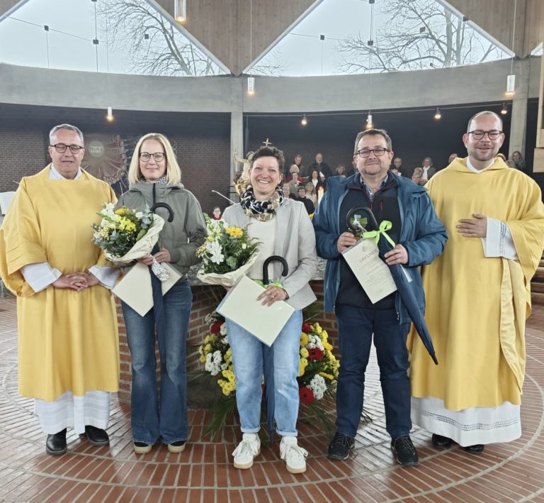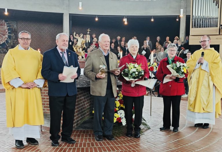 Für 30 Jahre im ehrenamtlichen Einsatz erhielt Herr Anton Rathgeb das Ehrenzeichen unserer Pfarrei in Silber. Für über 40 Jahre im Ehrenamtlichen Einsatz wurden Elisabeth Bauer und das Ehepaar Erna und Hermann Huber mit dem Goldenen Ehrenzeichen der Pfarrei geehrt. Das Ehrenzeichen der Pfarrei wird in Silber und in Gold verliehen. Es zeigt unser Turmkreuz im verkleinerten Maßstab und wird von der Gold- und Silberschmiede Dochtermann in Augsburg exklusiv für uns gefertigt. Ein kleines äußeres Zeichen der Dankbarkeit und Wertschätzung für unserer Haupt- und Ehrenamtlichen.