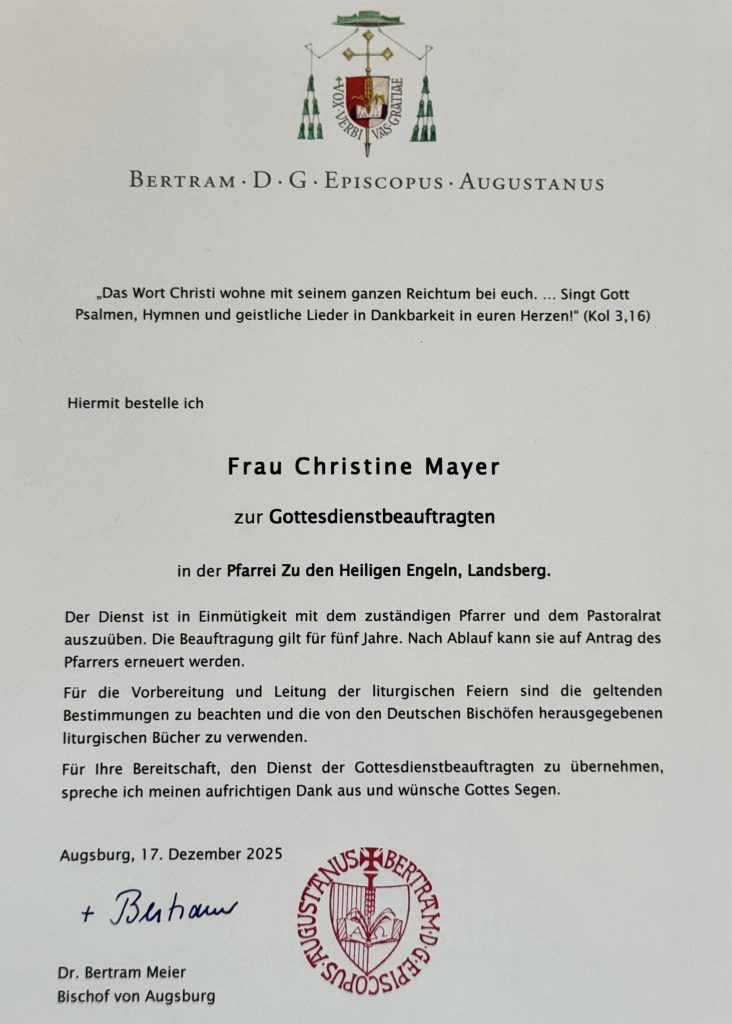 Wir freuen uns, dass Frau Christine Mayer zu diesem besonderen Dienst bereit ist und ihn in unserer Pfarrei in Absprache mit Pfarrer Herzel ausüben wird.